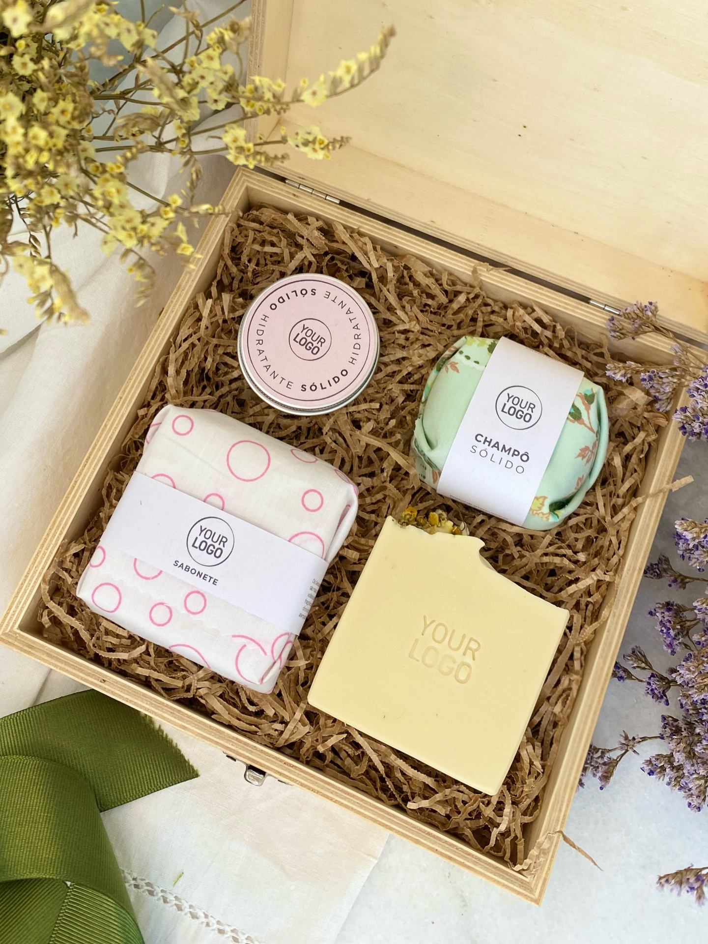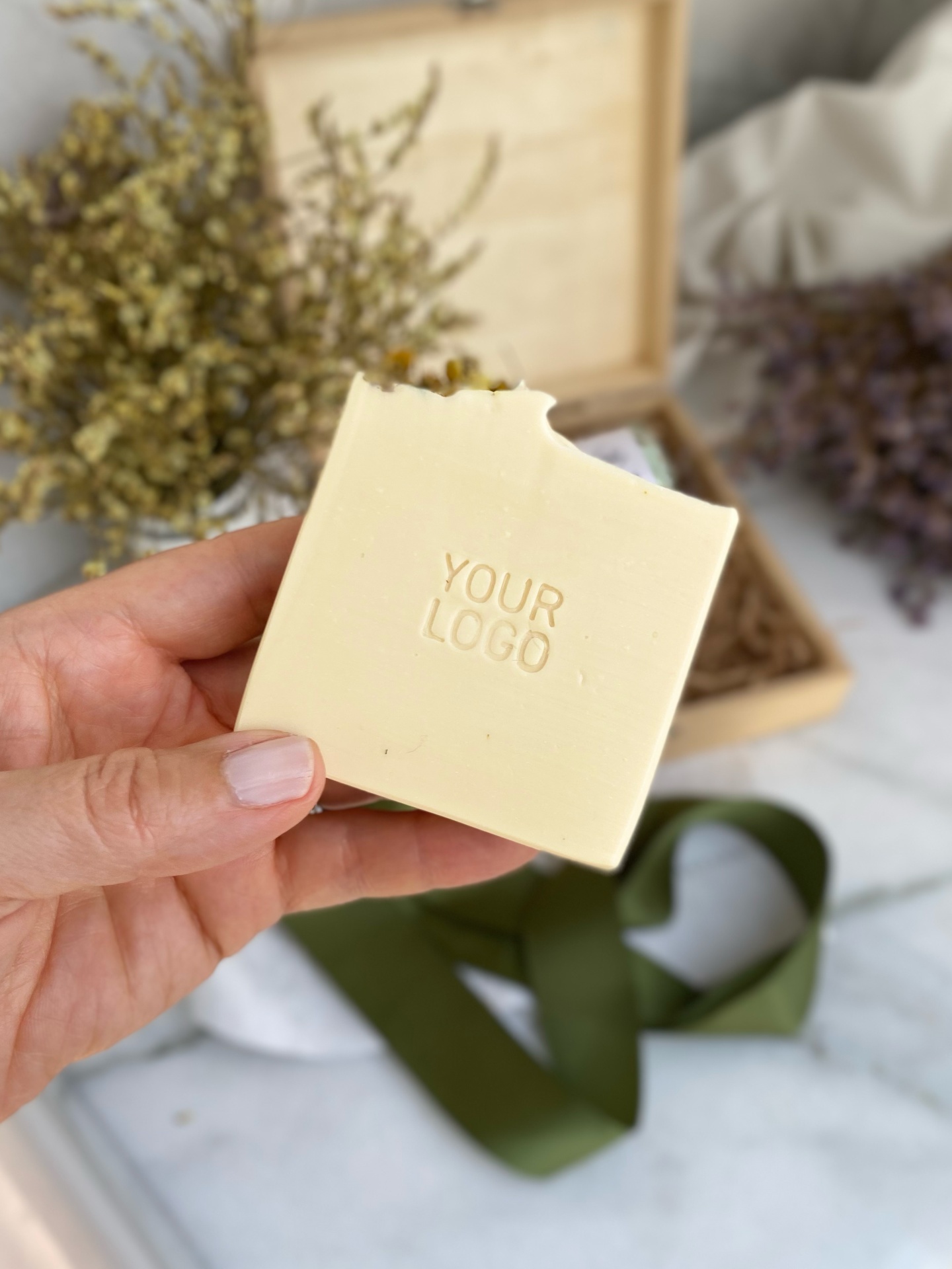 • Sabonete quadrado creme com inscrição YOUR LOGO segurado por mão contra fundo com caixa, fitas verdes e flores secas