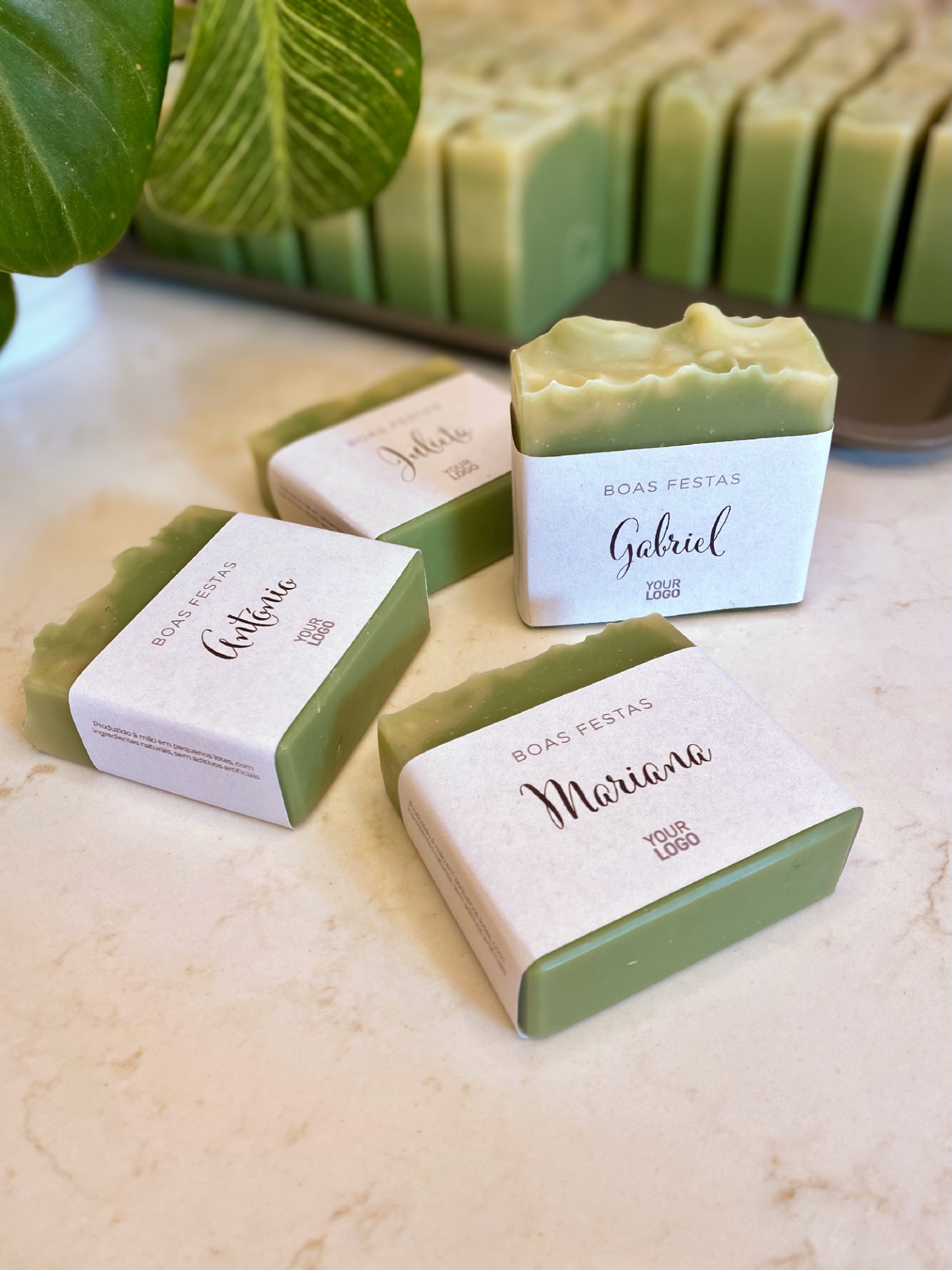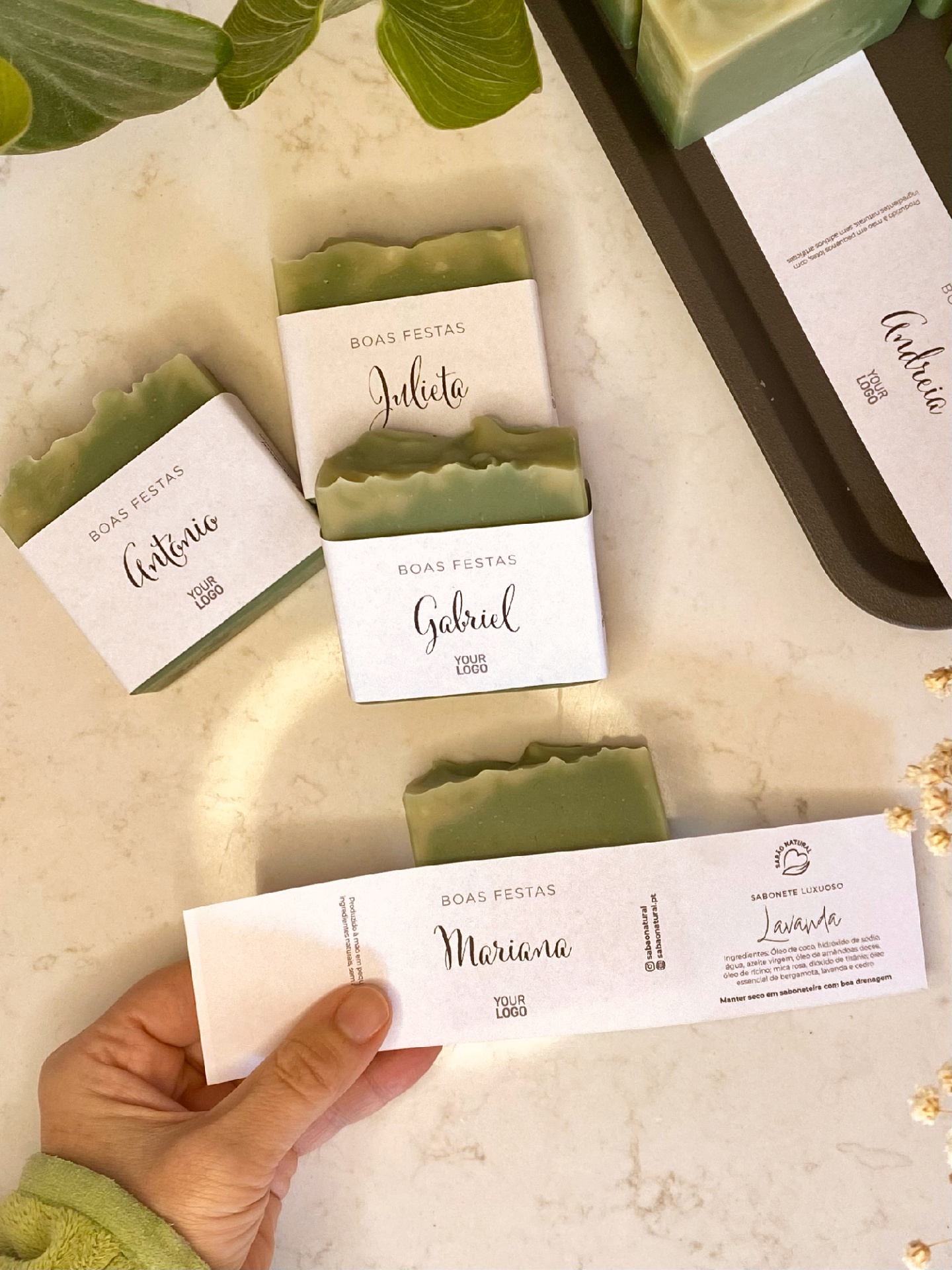 • Sabonetes verdes embalados personalizados com nomes e texto de boas festas sobre superfície clara com folhas verdes.